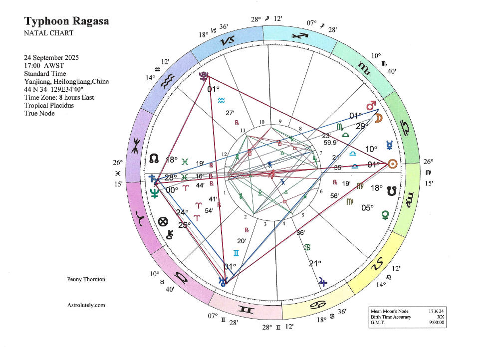 There were any number of events worthy of astrological representation over the last few days, but the symbolism of a super typhoon making landfall and the destruction that followed works for any number of eye-watering events of the past seven days. A lot of them beginning with the letter T: Typhoons, Tariffs, Tylenol, IdenTiTy cards and Trump’s speech at the United Nations. But let’s keep to the weather for the moment.