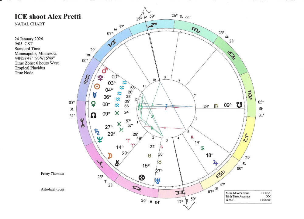 At first glance, there’s not a lot to see in the above chart for the moment Alex Pretti was fatally shot. The prevailing line-up of personal planets and Pluto in Aquarius is seen here in the twelfth house of shadows and secrets, and the ruler, Neptune, is conjunct Saturn in the first house sextiling Uranus. But those factors tell a story. The actions of the ICE agents were clouded in confusion – is that a gun or a phone? – and it remained for videos taken by onlookers to see that, contrary to the narrative adopted by the administration, Pretti was not brandishing a gun, and that he was already on the ground when he was shot. And while trigger-happy Uranus was trining Mars and Pluto and sextiling Saturn and Neptune, whatever the harmony of the angular relationships, you’re still dealing with a combustible group of planets. Plus, the nodal axis was flanking the Ascendant, giving a nod to the eclipses of last September and those to come in February and March.