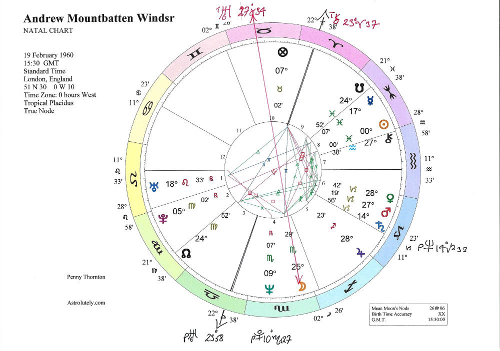 Andrew Mountbatten-Windsor was born on 19 February sixty-six years ago. Proud (and entitled) Leo rises with iconoclastic and wayward Uranus conjunct the Ascendant. I must add that Leo has many wonderful qualities too – warmth, vibrancy, courage and strength – so not every Leo-rising person is a malignant narcissist. Just Andrew Mountbatten Windsor and Donald Trump maybe. His Sun at zero degrees, zero minutes of Pisces is placed in the Pluto-ruled eighth house along with Mercury, and his Moon is to be found in the Pluto-ruled sign of Scorpio. Not everyone with such astrological components is drawn to the night, but the pull of the mysterious, the magical and the forbidden will be there. Andrew, for instance, might have channelled his interests and talents into becoming a therapist, a deep-sea diver, a crime writer or criminologist. As it is, his level of consciousness has drawn him into a world in which depravities and corruption thrive, a world in which the light is lost.