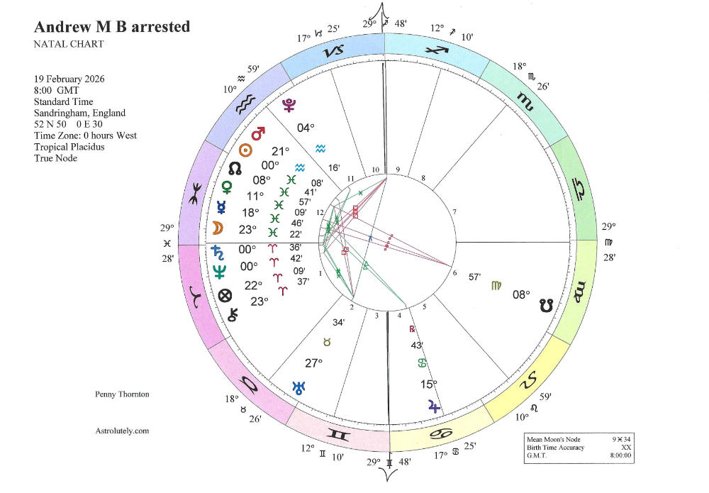 Transiting Uranus has been hovering over his Moon for the past year, a year in which brother Charles has been trying to remove him from Royal Lodge. The King achieved his ends a matter of weeks ago and Andrew must have had barely enough time to unpack the video games before the knock on the door came. The Moon rules his twelfth house – the house of one’s undoing, the house of incarceration – so Uranus has a role to play in potentially relocating him to lodgings at His Majesty’s pleasure.