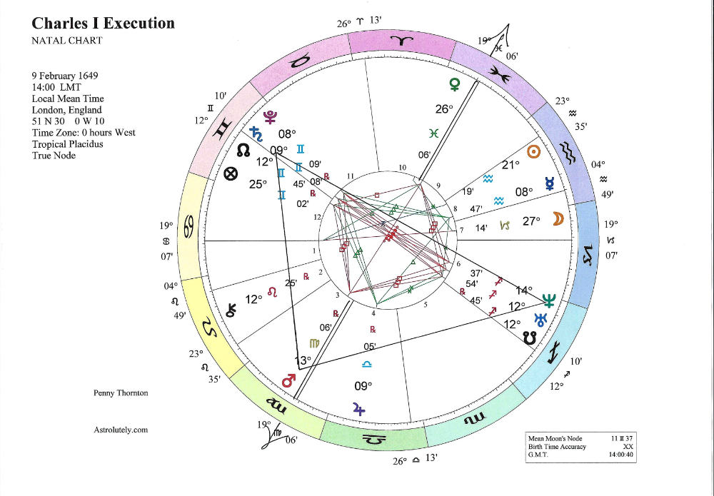 I just had to look at the astrology of that terrible time. And what did I find, but on the day Charles I was executed, Saturn and Neptune were in opposition, (as they were at the abdication of Edward VIII) thus resonating with the same themes that we are experiencing today – atonement and end-of-regimes – only the astrology was marginally worse since Neptune was conjunct Uranus and Saturn conjunct Pluto. And all four planets were squared by Mars. Plus, days after the establishment of the Commonwealth there was a solar eclipse.