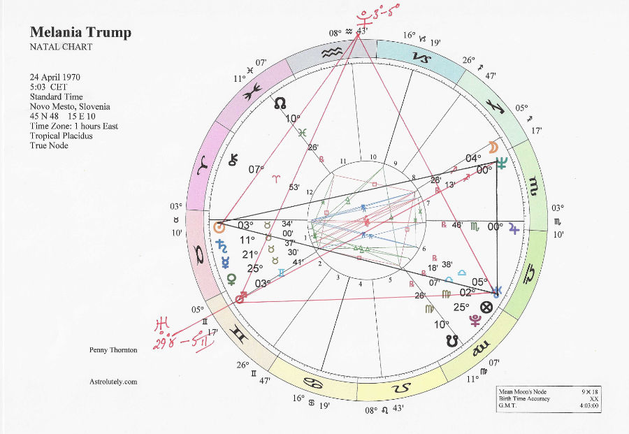 As you can see from the above chart, Melania has a Boomerang alignment – the Sun in Taurus is inconjunct Uranus and Neptune and opposed by Jupiter, and at this point in time, transiting Pluto is squaring the Sun-Jupiter opposition and triggering the rest of the configuration. Not only this, but with her Mars at three degrees Gemini, Uranus will shortly conjoin it.