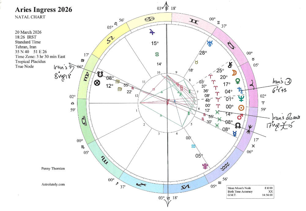 “My feeling is… that this war is America’s folly. The attack on Iran, its whys and wherefores and its legitimacy are in doubt and typical of Neptunian chaos and confusion, illusion and delusion. It has been ill-conceived and there are far too many unseen factors to contend with. At the very least, this war will be a stain on Donald Trump’s presidency… America will pay a heavy price for its actions… and this war will have untold consequences. Maybe we’ll see signs of light once Mercury turns direct (20 March) but even if the missiles stop in a matter of weeks, what has been stirred up may take years to settle down. And, one way or another, Iran and its proxies will not let its enemies’ actions go unacknowledged. There will be trouble. And on the streets of Western cities.”