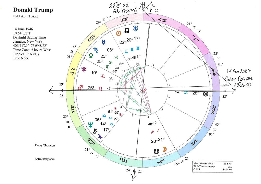 Currently Uranus is squaring his Mars and Ascendant, and the recent solar eclipse, which squared Uranus, opposed his Mars and Ascendant. Trump was born on a lunar eclipse so he is more sensitive to eclipses, whether that means he is emboldened by them or his life is shaped by the events they preside over. In this case, the eclipse presided over Operation Epic Fury, and we have yet to find out whether the results of this action will prove to be a feather in his cap or the means of his political demise. I suspect the latter.