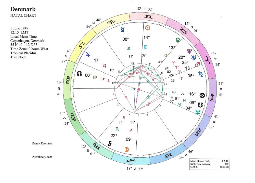 The prospect of war is not something immediately leaping out of Denmark’s chart, however, it is rowing into trouble. Pluto has been squaring natal Pluto and Uranus for the past three years, during which time Queen Margrethe II abdicated in favour of her son, so Denmark has a new King and Queen. (Out with the old, in with the new.) Saturn is returning to its natal position, and it will get there in April of this year. A Saturn return is always about the coming of age, it is a time of reappraisal, a time when chickens come home to roost. So, Denmark is going to face some challenges this year, especially as there are two eclipses to take into consideration too: the first, a total lunar eclipse of 3 March will square its Sun and the second, a lunar eclipse on 28 August, will fall on its Neptune. Somewhat ironically, Donald Trump’s natal Uranus (18 degrees of Gemini) falls on Denmark’s Midheaven…