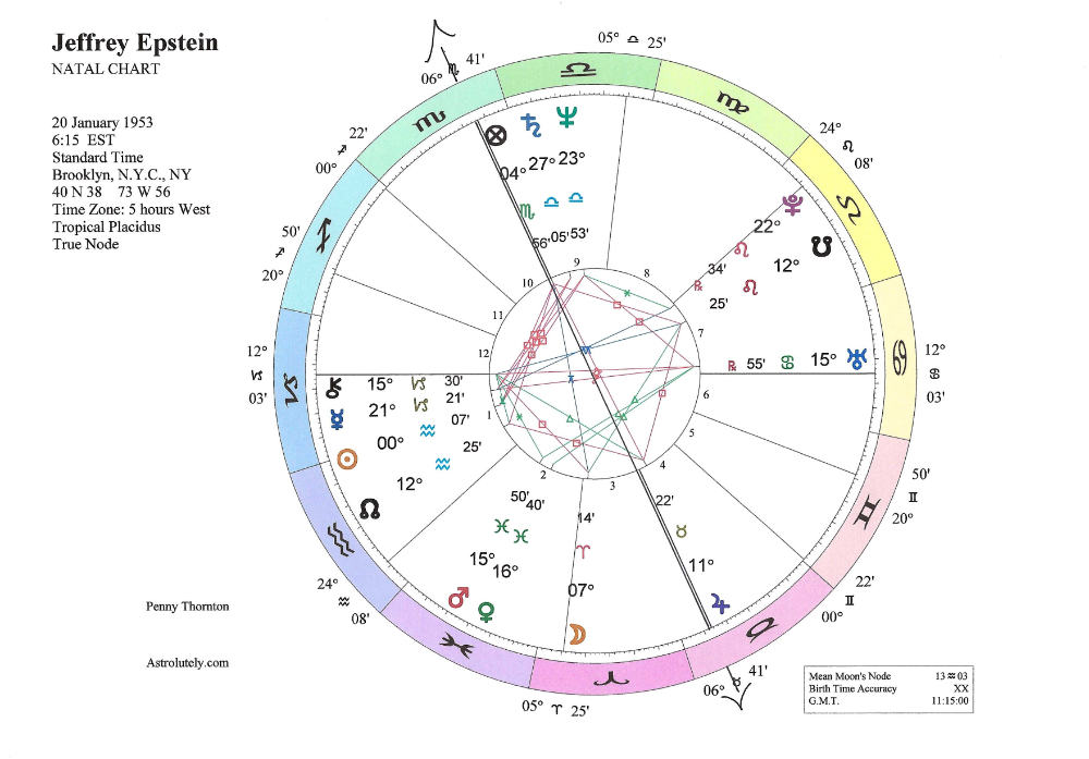 Years ago, in the process of writing a book on reincarnation, I worked with a psychiatrist who regressed a number of people to a former life. I then set up charts of those former lives to see what connections, if any, there were with the current birth charts. I was amazed at the synchronicities and the way those original charts appeared to be responding to the transits at the time of the regressions. We may die. But our consciousness lives on, so why should we be surprised that a life long-gone should still carry a resonance. Which is a longwinded way of pointing out that Jeffrey Epstein’s chart is resonating with the current transits and progressions.