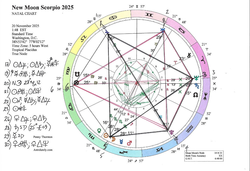 IN THE WANING cycle of the Moon, chapters end and situations that have peaked, wind down. And so it was that five days after the full moon in Taurus, the US Government shut-down ended. The shutdown had begun on 1 October after Congress failed to agree a spending plan for 2026. Over the course of the next forty-three days, the Republican-controlled House continued to represent the bill and the Democrat-controlled Senate continued to reject it. On 10 November, a handful of Democrats caved in and the appropriations legislation was passed. In those forty-three days, 900,000 federal employees were furloughed, another two million worked without pay, SNAP food payments were suspended and thousands of flights were cancelled.