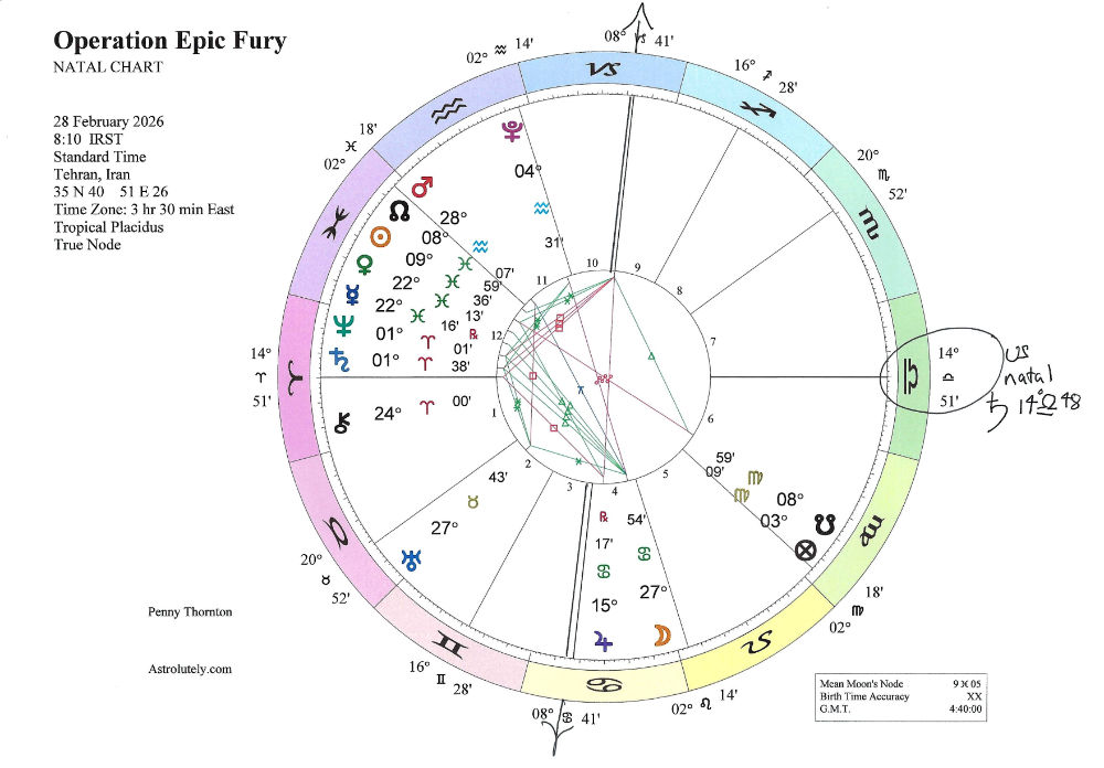 I’m going to start with the chart of Operation Epic Fury from the standpoint of the United States. The planets occupy the same degrees as they do from Tehran’s perspective but, of course, they fall in different parts of the horoscopic circle. Scorpio rises, placing Pluto, the ruler, in the third house, opposing the Moon in the ninth. In a nutshell, America is sending a powerful message to the peoples of a distant country! Mars, the old ruler of Scorpio, is placed at 28 degrees of Aquarius (the degree of the recent solar eclipse) and closely squaring Uranus in the seventh house. In a nutshell, America is using its fighting power against an “open enemy”. That the degree of the solar eclipse is picked up, in this case by Mars, adds a certain aura of fate and destiny to the mix.